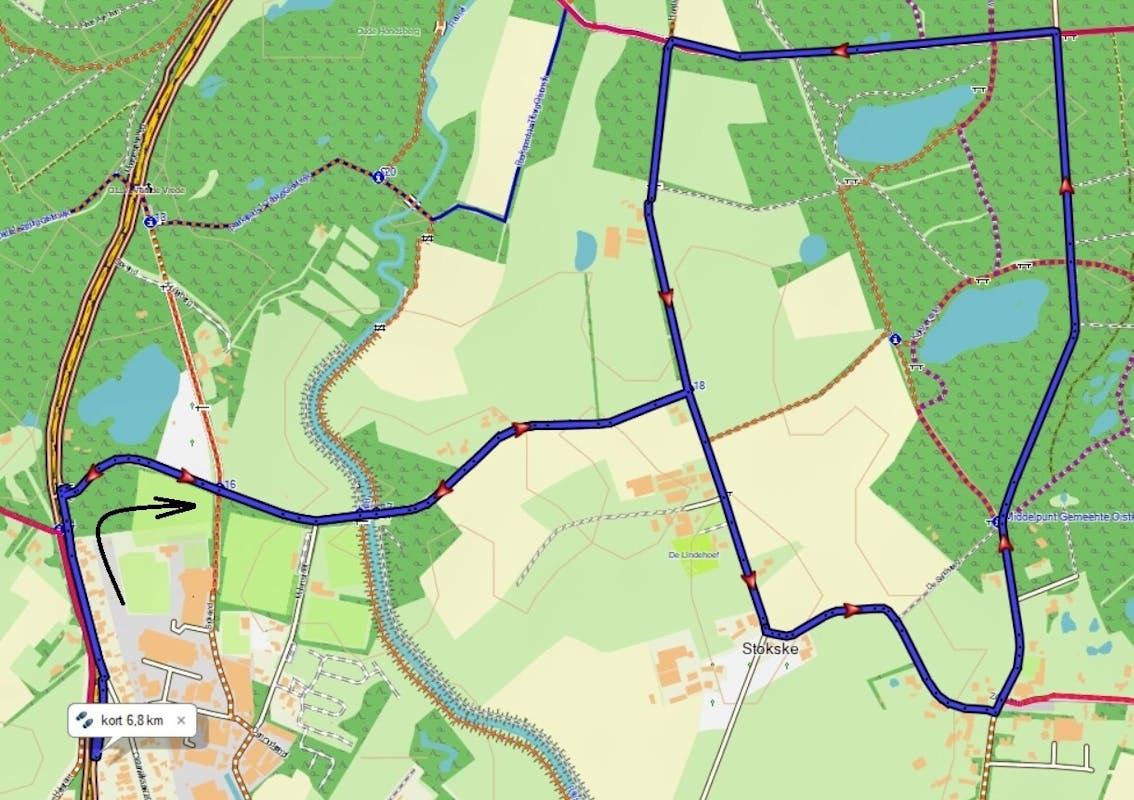 Daarom hebben Jan en ik ervoor gekozen om een wandeling te plannen geheel op verharde wegen. Consequentie is wel dat we dat niet rond krijgen met het wandelknooppuntennetwerk. Maar met medewerking van Jan lukte het uiteindelijk wel een geheel knooppuntenvrije route te programmeren, die je bijgaand aantreft. Dus nu geen knooppunten nummers, maar een uitgetekende route.