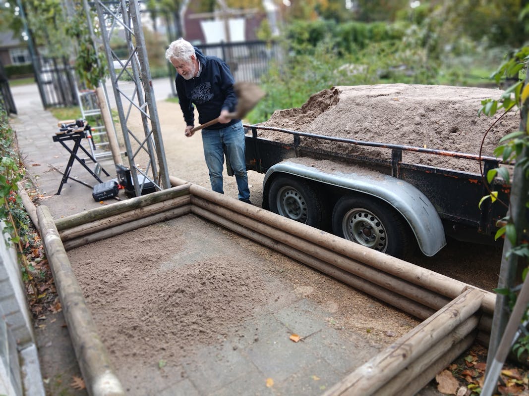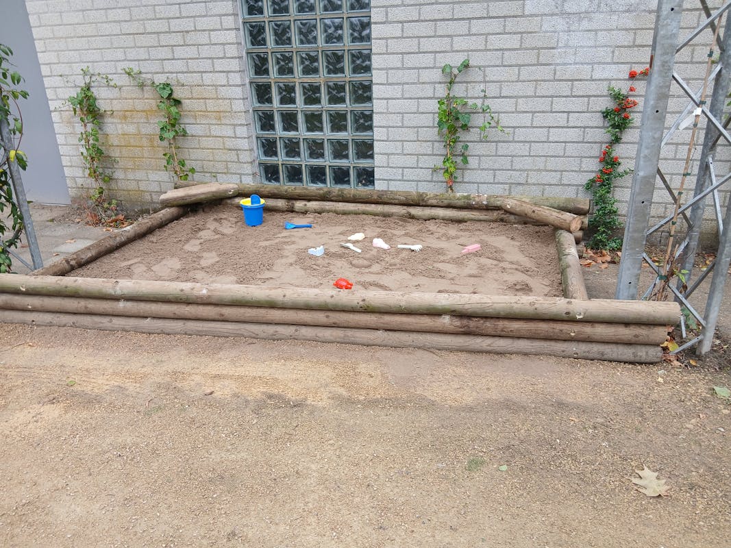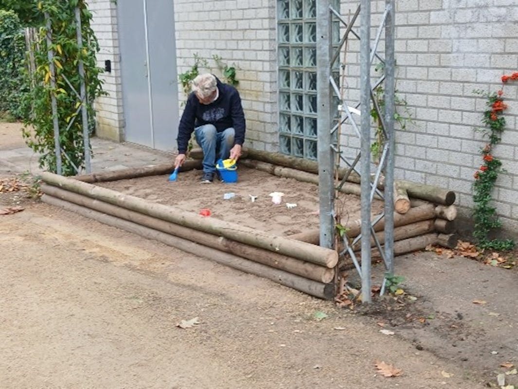 Het is best druk met vaste wandelaars en bezoekers die de rust in ons parkje zeer waarderen en bewonderende woorden uitspreken hoe leuk en mooi het allemaal is geworden. Vooral de namen bij de diverse bomen en struiken vindt men leerzaam. Ook vragen regelmatig mensen of er nog iets bijkomt zoals een schommel of zo. Scouting heeft besloten geen schommel omdat er al een aantal leuke speelobjecten zijn en een schommel staat in iedere speeltuin al en dit speelpark moet iets bijzonders blijven vergeleken bij een “gewoon” park. Wat wel een leuke aanvulling zou zijn is een leuke zandbak voor de vele kleine bezoekers die met opa en oma of hun ouders hier komen spelen. Op verzoek van diverse bezoekers hebben wij dus, als klusgroep van het park, een scoutingachtig exemplaar voor hen gemaakt. Deze is ondertussen gezaagd, in elkaar gezet, gevuld met zand en speelgoeddingen om iets leuks te kunnen "bakken" wat wij vroeger ook leuk vonden. Veel plezier in/met onze nieuwe aanwinst en maak er "Moergestel bakt van alles ook in de zandbak" van.