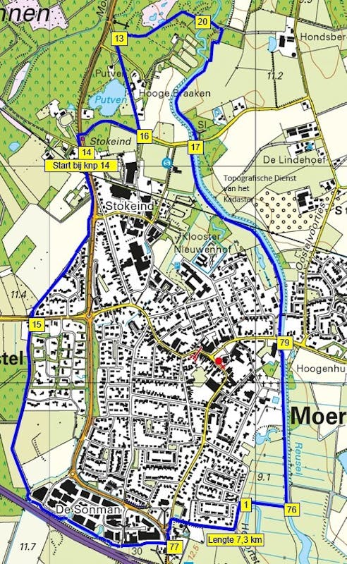We starten onze wandeling op het kruispunt Heukelomsebaan/Oisterwijkseweg bij knooppunt 14. We lopen richting knp 15 via de Oisterwijkseweg en De Heistraat naar het Bedrijventerrein De Sonman tot de Schoolstraat hier gaan we via de fraaie Standerdmolen aan de Scheerman richting wegwijzer -het middelpunt van de Benelux- vlak bij de ijsbaan naar de stuw bij De Reusel op dit punt kijk je over het prachtige natuurgebied het Moergestelbroek, het grootste weidevogelgebied van Noord-Brabant. Over de kade langs De Reusel wandelen we verder richting Oirschotseweg. Ter hoogte van het gezondheidscentrum en het monument van Generaal sir Colin Muir Barber steken we over en vervolgen onze route over de kade van De Reusel tot de stuw in de Waterhoefstraat, hier steken we nogmaals over en vervolgen onze tocht langs De Reusel. Op de plaats waar de kade bij het draaipoortje eindigt gaat De Reusel kronkelend verder. We wandelen via het Peerkespad en Kloosterpad tot het Stokeind (vlakbij de Mariakapel). Via het Stokeind naar de Waterhoefstraat naar het beginpunt.
