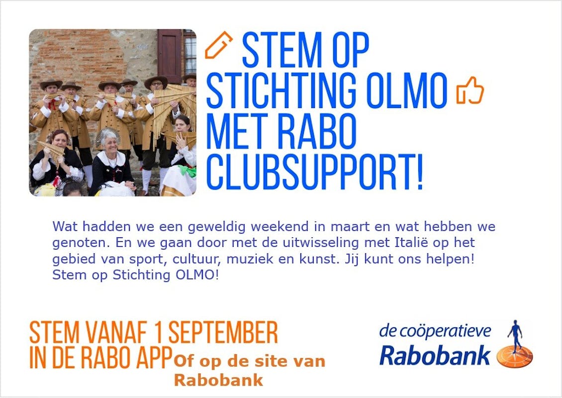 Binnenkort start de actie Rabo Clubsupport weer. De Stichting OLMO zet zich in om uitwisselingen met het Italiaanse Olgiate Molgora mogelijk te maken op het gebied van Muziek, cultuur, sport en kunst. Jij kunt ons daarbij helpen door op ons te stemmen bij deze actie. Voor de doelstelling van de stichting zie ook https://www.stichting-olmo-olgiate-moergestel.nl/