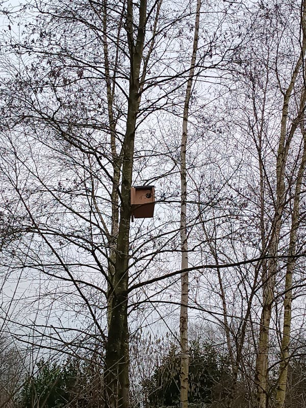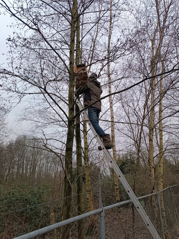 Soms regent het heel lang en ben je het op een gegeven moment beu. Ik ben iemand die het niet erg vind om door een buitje regen te fietsen of te wandelen maar 3 maanden lang is me net te gortig. Wat was het fijn dat het even gestopt is 2 weken geleden. Een paar open dagen met wat zon en de winter mag beginnen dacht ik toen nog. Die is begonnen ook en daar word ik blij van. Toen belde Marco me op dat hij nog een uilenkast had gehad voor zijn verjaardag en dat we die nog op moesten hangen in ons nieuw speelpark. Wat voor uilen komen daar dan in vroeg ik. En zitten er hier dan uilen? Jazeker, en het is een kast voor steenuiltjes en die past mooi in ons nieuwe natuur gebiedje. Nou, het was prachtig weer dus wij met z'n tweeën aan de slag. Waar hij moest komen hangen had hij al lang bekeken en hoe was aan mij de vraag. Samen vonden we de oplossing en met ladder en wat gereedschap hebben we vorige week vrijdag de kast opgehangen langs de rand van het park te zien vanaf de wandelroute langs de Reusel en in de buurt van onze toekomstige uitgang van het parkje nabij de Reusel. Nu maar hopen dat het nut heeft want dat zou toch weer een kroontje op ons werk worden. We gaan het zien. Hierbij enkele foto's van het ophangen.