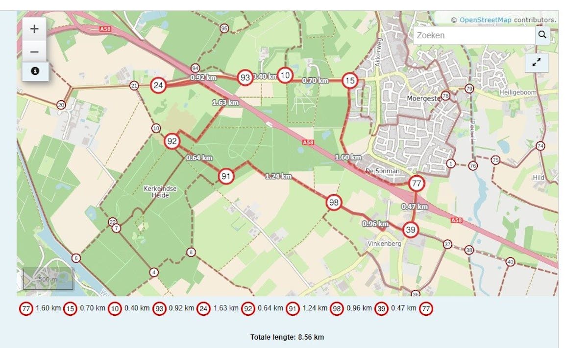 Zoals eerder aangegeven kan de lange route worden ingekort en is dan interessant voor de wat minder geoefende wandelaars. Inkorten kan door bij knp 92 te kiezen voor knooppunt 91. En ook door direct na de oversteek van de A58 links de trap naar beneden te nemen. Deze route is dan ongeveer 8 km lang.