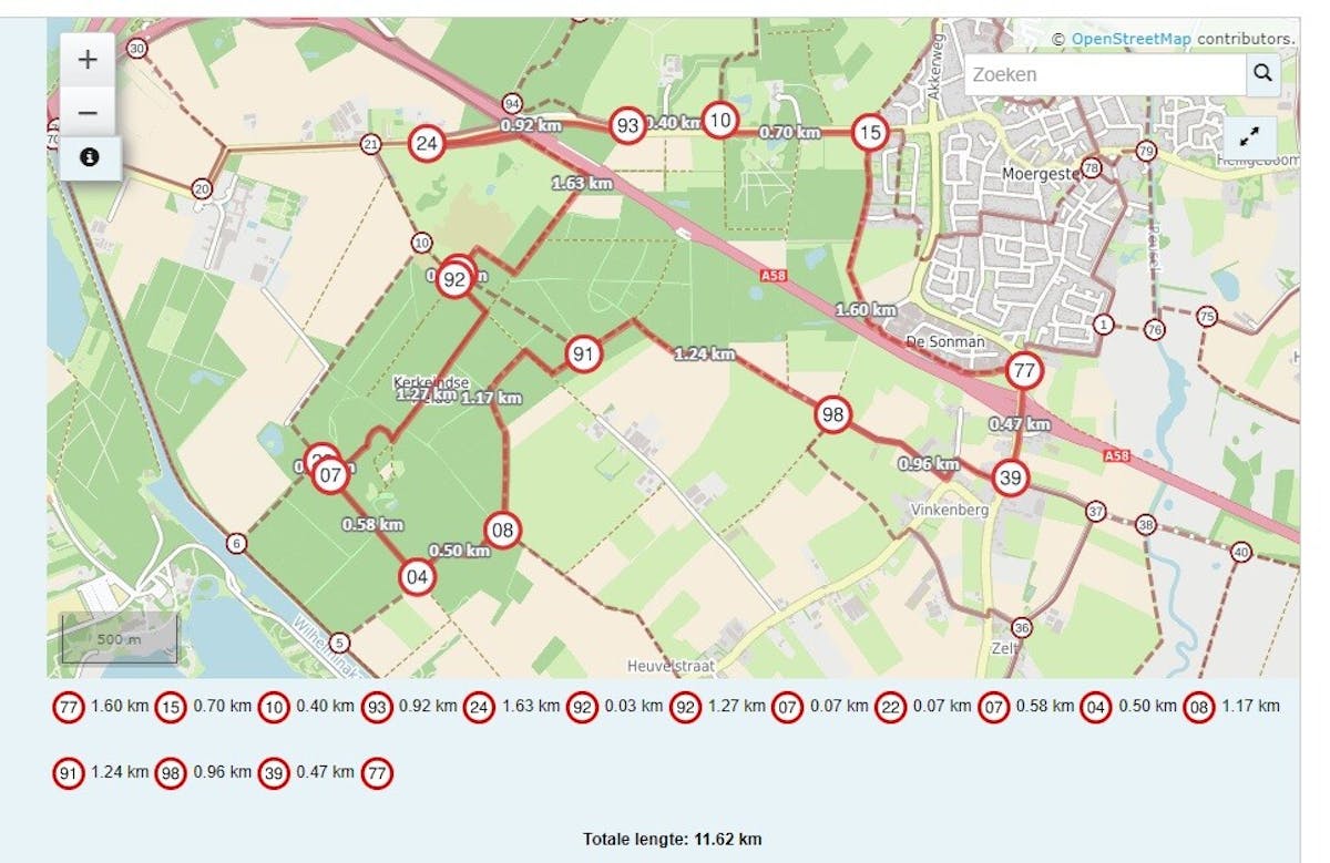Er is dus een lange route voor geoefende wandelaars. De lengte van de wandeling is 11.62 km en voert ons via Bedrijventerrein De Sonman naar het heidegebied op de Kerkeindseheide aan de overkant van de A58.