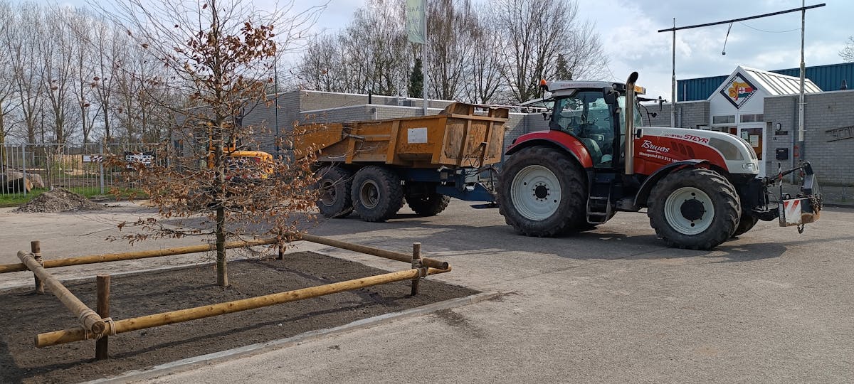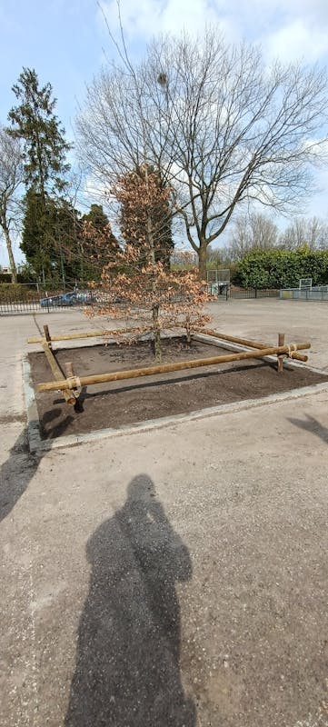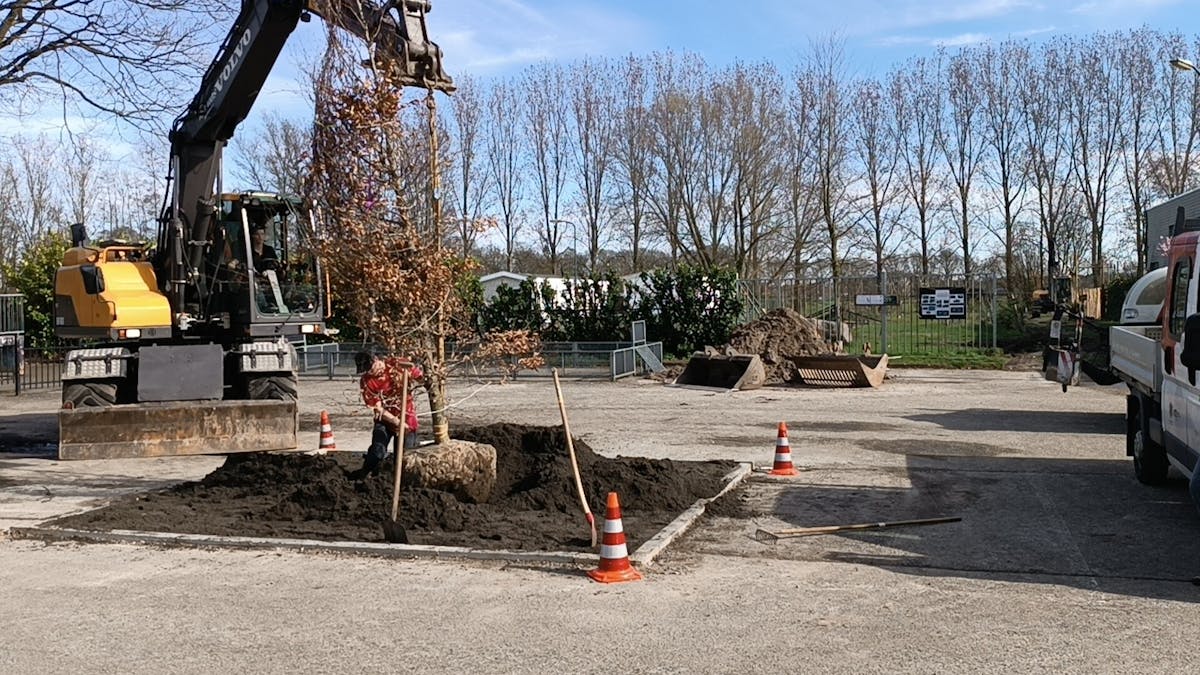 Ineens gaat het snel allemaal bij de aanleg van ons speelparkje, scouting veld en directe omgeving. We hebben behoorlijk wat tegenslag gehad van het weer en ons terrein bleef te nat om graafwerkzaamheden uit te kunnen voeren. We zijn vorige week begonnen met aanleg van plantgaten op de parkeerplaats en plaatsen van 2 rode beuken. Ook voor ons gebouw een plaatje. Weer wat "nieuw groen" bij in de Bosstraat. De parkeerplaatsboom hebben we "versierd" met scouting materiaal.