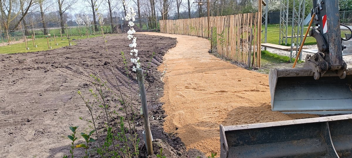 Uitgraven pad, zand verspreiden en daarna puinverharding aanbrengen waar overheen een afwerklaag van waterdoorlatend half verhardingsmateriaal zodat ons parkje goed toegankelijk is voor alle denkbare bezoekers. Eigenlijk zeggen beelden meer dan woorden dus hier volgen die en op MTV.