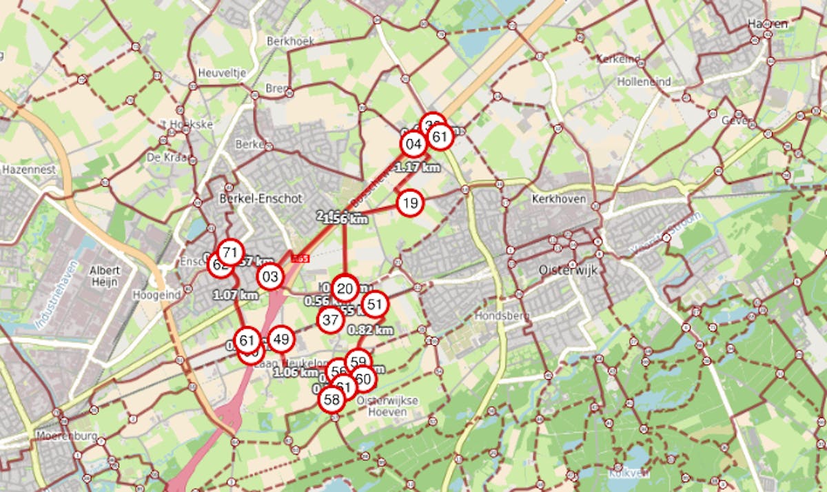 De lange route is ongeveer 12 km, met de volgende knooppunten.: