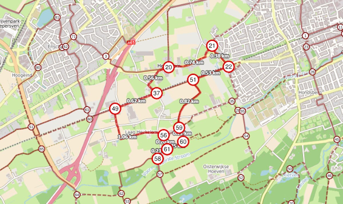 58 – 61 – 56 – 49 – 37 – 20 – 21 – 22 – 51 – 59 – 60 – 61 – 58 (zie foto met kaartje van de korte route)